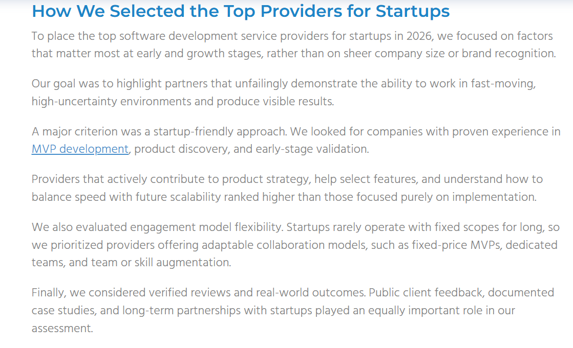 Not all outsourcing companies are built for startups. Choosing the wrong partner can lead to delays, misalignment, and wasted resources. Startups should prioritize the following when evaluating outsourcing firms: