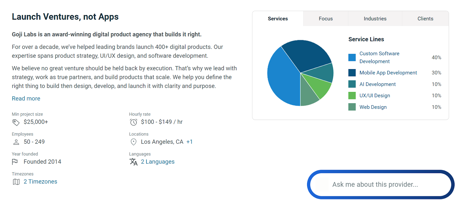 Goji Labs places product design and strategy before code. This makes them an excellent choice for startups that need to define user experience and validate product-market fit before committing significant capital to full-scale development.